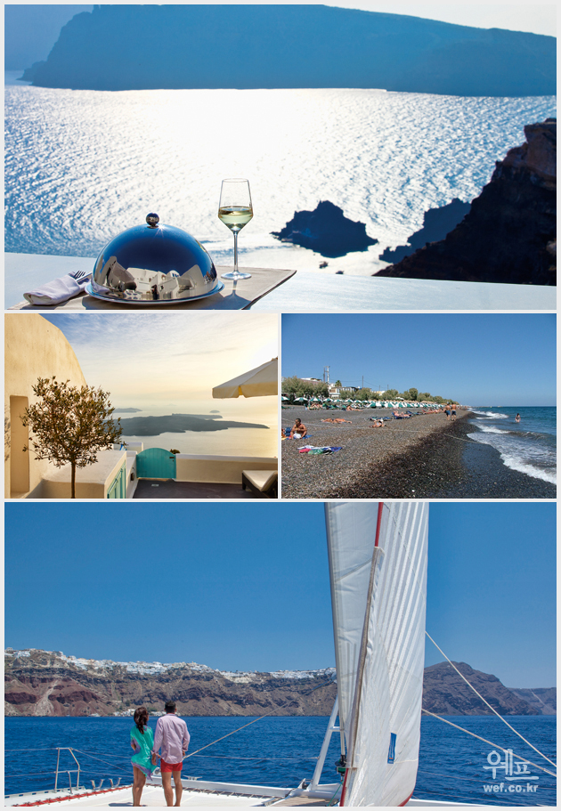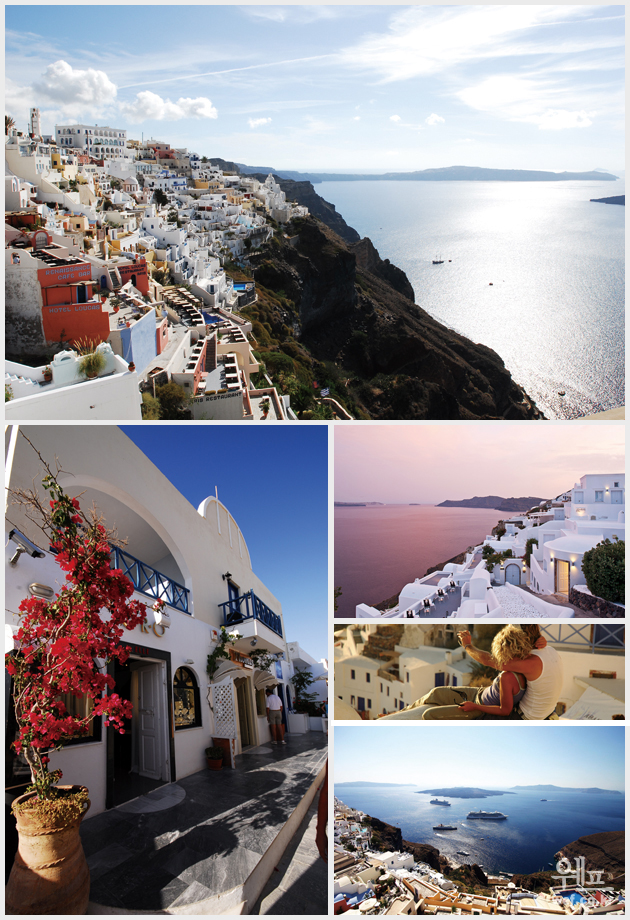 드디어 메일 수신함에 그림엽서와 같은 장면의 사진들이 왔다. 자 그럼, 에디터가 가보고 싶은 곳, 그냥 막 찍어도 그림엽서의 멋진 풍경이 되는 곳을 소개한다. 그리스 산토리니 섬, 신화와 고풍스러운 아름다움, 낭만이 있는 태양과 바다의 천국 지중해 특유의 푸른 바다와 하얀색 벽돌집이 보여주는 강렬한 색의 대비, 유럽과는 또 다른 지중해만의 정취를 만날 수 있는 그리스 산토리니 섬. 신 중의 신 제우스, 바람둥이 남편 단속에 무던히도 바빴던 그의 아내 헤라, 사랑과 미의 여신 아프로디테. 인간사의 모습처럼 생생한 신화 속의 올림푸스 신들, 바로 그들의 자취가 이곳 그리스에 발을 내딛는 순간 느껴진다. 일 년에 서너 달을 제외하고는 화창하고 햇볕이 따갑게 내리쬐는 더운 날씨인 그리스가 아니면 도저히 소화할 수 없는 풍경, 더구나 근사한 레스토랑(Taberni)에서 바다가재를 포함한 해물요리와 그리스산 포도주 한잔을 맛보면 어느새 그 지중해의 정취 가득한 신비의 섬, '산토리니'