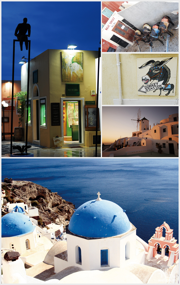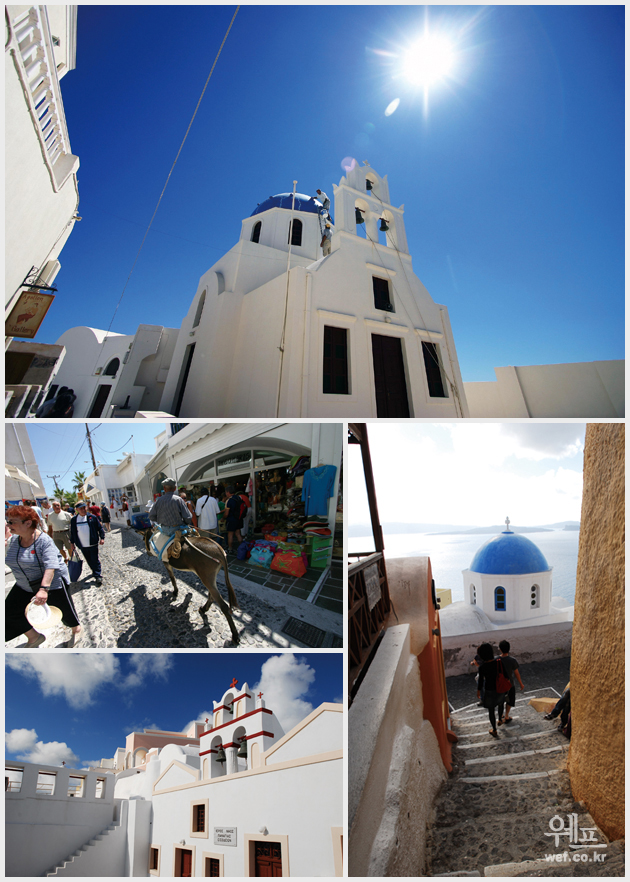 당나귀를 탈 때에는 아슬아슬한 절벽 길에서 금방 바다 속으로 떨어질 듯한 곡예를 거쳐야 오를 수 있다는 각오만은 해두는 편이 좋은데, 어쨌든 천천히 오를 때 차츰차츰 눈앞으로 드러나는 시내 전경은 충격적일 만큼 아름다운 모습임에 틀림없다. 단, 당나귀를 탈 때는 주인아저씨와 흥정 시 주의하지 않으면 자칫 바가지를 쓸 수도 있다. 산토리니의 또 한 가지 매력은 저녁마다 펼쳐지는 노을의 향연이다. 섬 북쪽에 있는 이아 마을의 일몰이 바로 그 주인공. 시내에서 버스를 타고 40분 정도 달리면 끝없는 바다가 붉게 물들어가는 장엄한 광경을 직접 만날 수 있다. 곳곳의 아담한 교회, 예쁜 종들도 그림의 한 조각을 더욱 예쁘게 맞춰주는 듯 싶다.